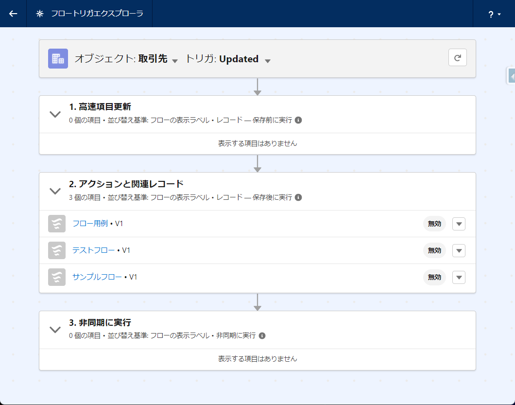 この例では取引先レコードが更新されたときに実行されるフローを一覧表示しています。フローは実行タイミングの種類ごとでは実行順に表示されます。ただし、現状各フローは次で紹介する実行順ではなく表示ラベル順になってしまうようです。
