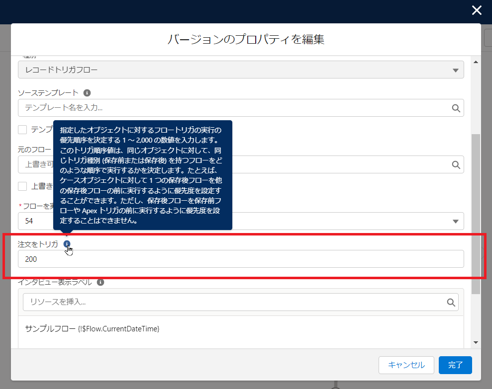レコードトリガフローの実行順序の指定「注文をトリガ」という項目があるのでここに優先度を数値で設定します。この項目を設定すると数値が小さいフローから実行されます。