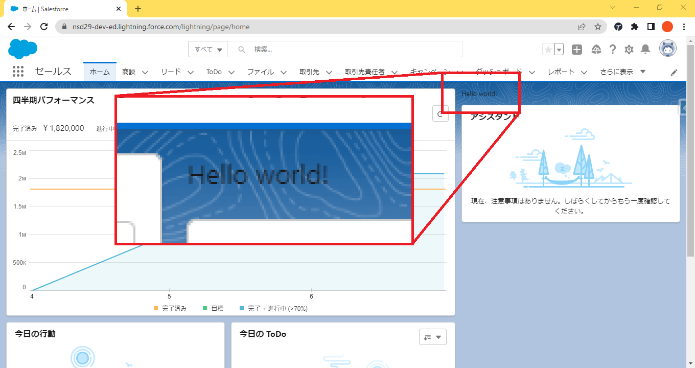 helloWorldコンポーネントをアシスタントコンポーネントの上にドラッグ&ドロップしてください。