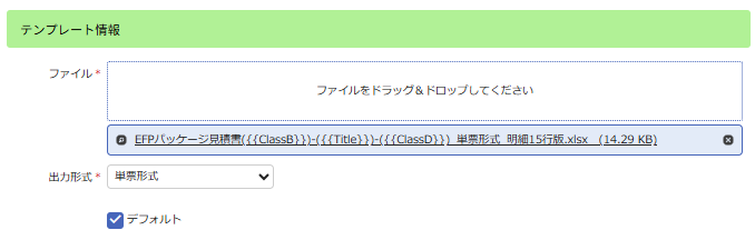 • テンプレートファイル名:EFPパッケージ見積書({{ClassB}})-({{Title}})-({{ClassD}})単票形式_明細15行版.xlsx