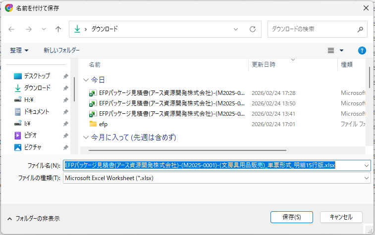 • Excel出力ファイル名:EFPパッケージ見積書(アース資源開発株式会社)-(M2025-0001)-(文房具用品販売)単票形式_明細15行版.xlsx