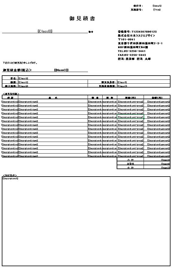 - 以下は見積書サイト(78586)の説明項目(DescriptionB)にgrid for Pleasanter(以下GFP)で作成項目のデータを単票形式のテンプレートを作成する例です。