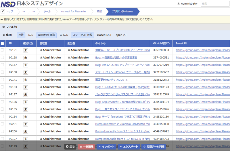 connect for Pleasanterで、GitHubのPleasanterのissuesデータを取得し、社内に導入してるPleasanterアプリに問題があったときに参考となる情報がないか確認します。