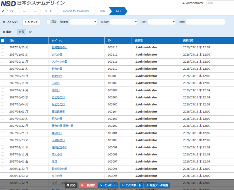 connect for Pleasanterで、去年・今年・来年の祝日データを取得し、プロジェクトのスケジュール管理や、期限日の自動計算(営業日計算)等に利用します。
